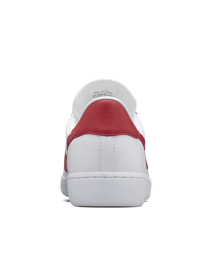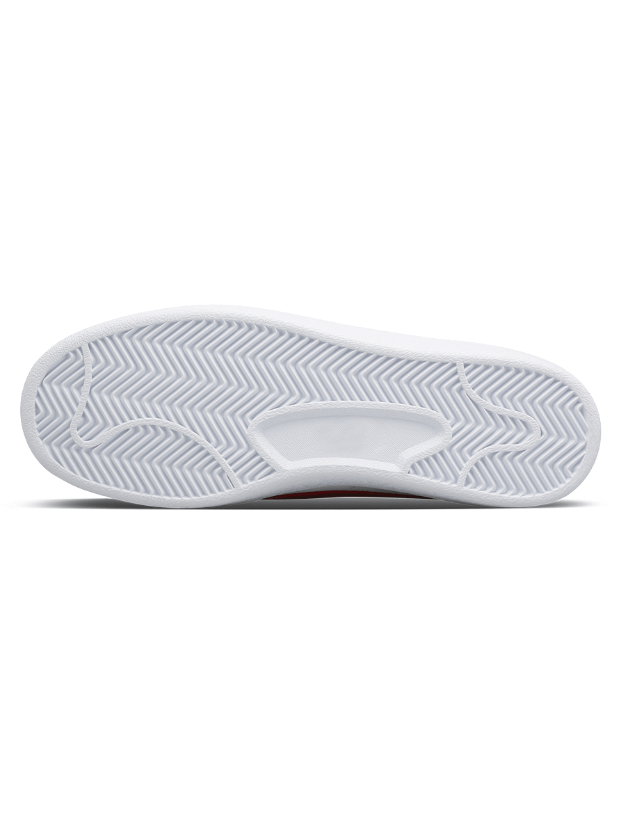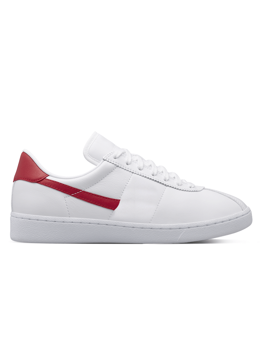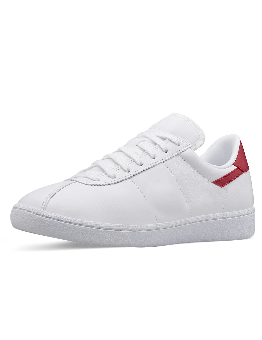 White leather sneakers. Featuring die-cut detail on the toe cap, red split suede leather heels, leather lining and rubber soles.
